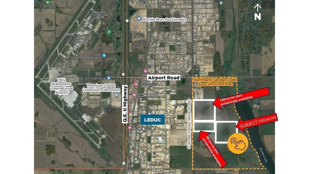 160 Acres. Located in the Northwest Saunders Lake ASP; Five minute drive to Edmonton International Airport; Adjacent to Leduc city limits and 10 minutes to Leduc core; Parcels can be purchased together or separately; Located south of Nisku Business Park; Parcel Size: 80 AC + 160 AC + 160 AC=400 Acres. Zoning: AG (Agriculture). Legal Description: West 80 - 4;24;50;6;NW East 160 - 4;24;50;6;NE - West 160 - 4;24;50;7;SW. Information herein and auxiliary information subject to becoming outdated in time, change, and/or deemed reliable but not guaranteed. Buyer to confirm information during their Due Diligence. (id:6289)