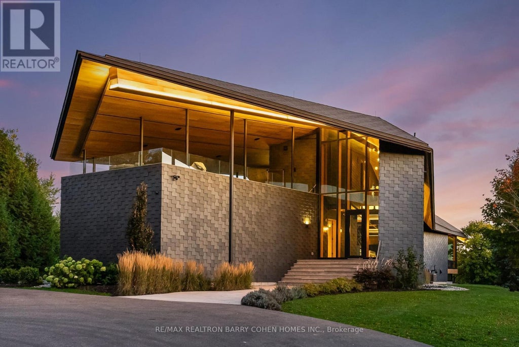 A jaw-dropping architectural statement in the heart of Caledon! This one-of-a-kind residence blends world-class design, natural beauty & uncompromising craftsmanship across 10,300 square feet of living space. Designed by Kariouk Architects w/interiors curated by the renowned Karin Bohn, the home has been celebrated in films, fashion shoots, & multiple design awards, standing as a true icon of modern architecture in Ontario. The exterior showcases a copper roof & natural slate stone siding wrapping both the façade & select interior feature walls-materials chosen for their rarity, permanence, & sculptural quality. Inside, the atmosphere is defined by floor-to-ceiling windows, dramatic lighting & solid white oak tongue-and-groove ceilings. The raised ground-floor design allows for continuous transom windows around the perimeter, filling the lower level w/natural light. A large central floor opening connects the two levels visually & spatially, framing the home's main fireplace & creating a dynamic double-height volume. Throughout the home, you'll find extensive custom millwork, steel beam & suspended walkways, & dramatic vaulted ceilings w/ambitious angles that celebrate the artistry of structure & form. The oak interior doors w/oil-rubbed bronze hardware add a warm, tactile contrast to the sleek architecture. The gourmet kitchen features Gaggenau appliances & is complemented by a secondary prep kitchen/pantry designed for seamless entertaining. Beyond the interior, an impressive covered deck-integrated into the roof system with Ipe floors & B/I speakers, oriented toward stunning elevated views. Outdoor living continues w/a fire pit, hot tub, & inground pool, all set against almost 100 acres of private, forested land-providing tranquility, privacy & notably reduced property taxes. This is not simply a home-it is a work of art, designed for those who value architecture, privacy & the seamless connection between design & nature. (id:6289)